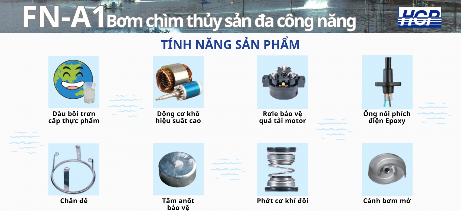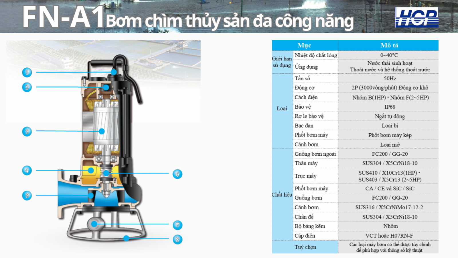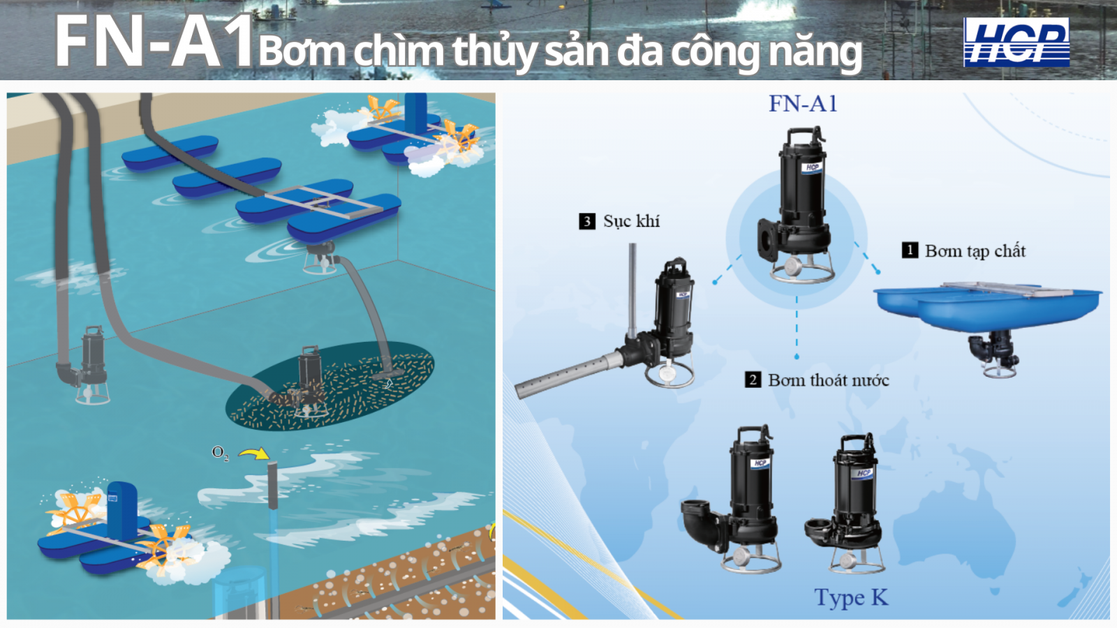 Máy bơm HCP được thiết kế đa chức năng, tăng khả năng cải thiện nước trong nuôi trồng thủy sản, thâm canh; tạo môi trường hoàn hảo cho sự phát triển của thuỷ sản chất lượng cao