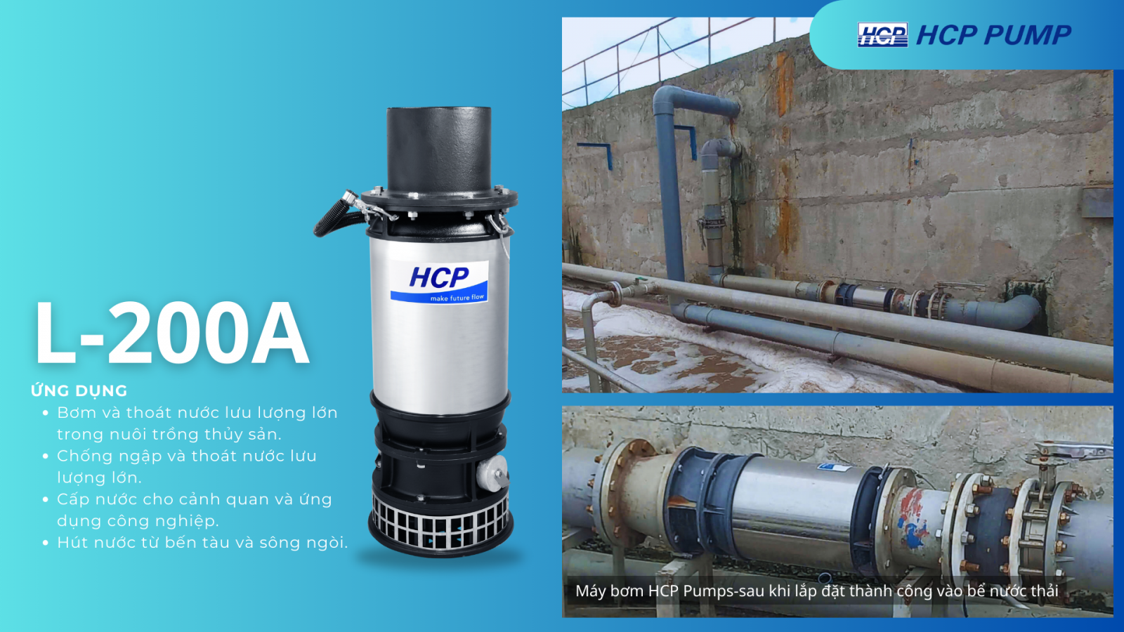 Bơm chìm L-200A thuộc dòng bơm lưu lượng cao, công suất lớn, đặc biệt phù hợp cho các ứng dụng xử lý nước công nghiệp quy mô lớn, cấp nước công nghiệp và thoát nước kiểm soát lũ. Cánh bơm chống mài mòn và cấu trúc chắc chắn cho phép bơm hoạt động ổn định ngay cả trong môi trường nước có tạp chất, mang lại hiệu suất cao và lưu lượng lớn liên tục. Hơn nữa, thiết kế vỏ bơm chắc chắn, phớt cơ khí kép và lớp phủ chống ăn mòn giúp kéo dài tuổi thọ bơm, giảm chi phí bảo trì và đảm bảo sự ổn định lâu dài của hệ thống.