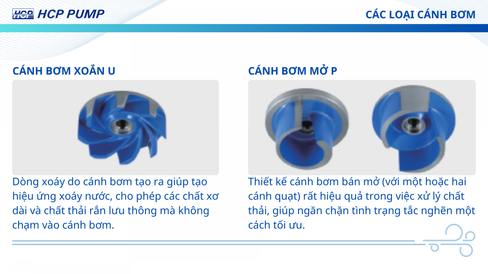 - Cánh bơm loại U/P được thiết kế nhằm tối đa hóa sự khác biệt về nhu cầu hiệu suất xử lý nước thải.