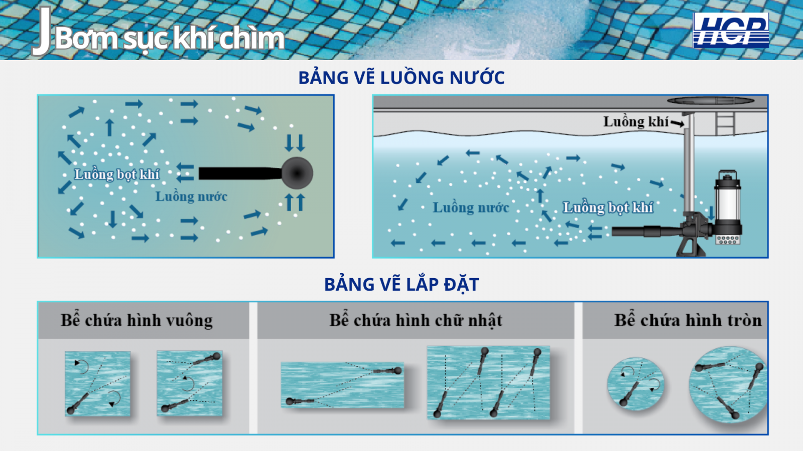 Thiết kế chìm – Máy bơm sục khí chìm chạy rất êm trong khi đặt chìm dưới nước và bạn cũng có thể lắp đặt nút giảm thanh trên ống hút khí để giảm mức ồn. Thiết kế máy bơm sục khí chìm có thể tiết kiệm chi phí xây dựng phòng cách âm vốn cần trang bị quạt gió bề mặt.