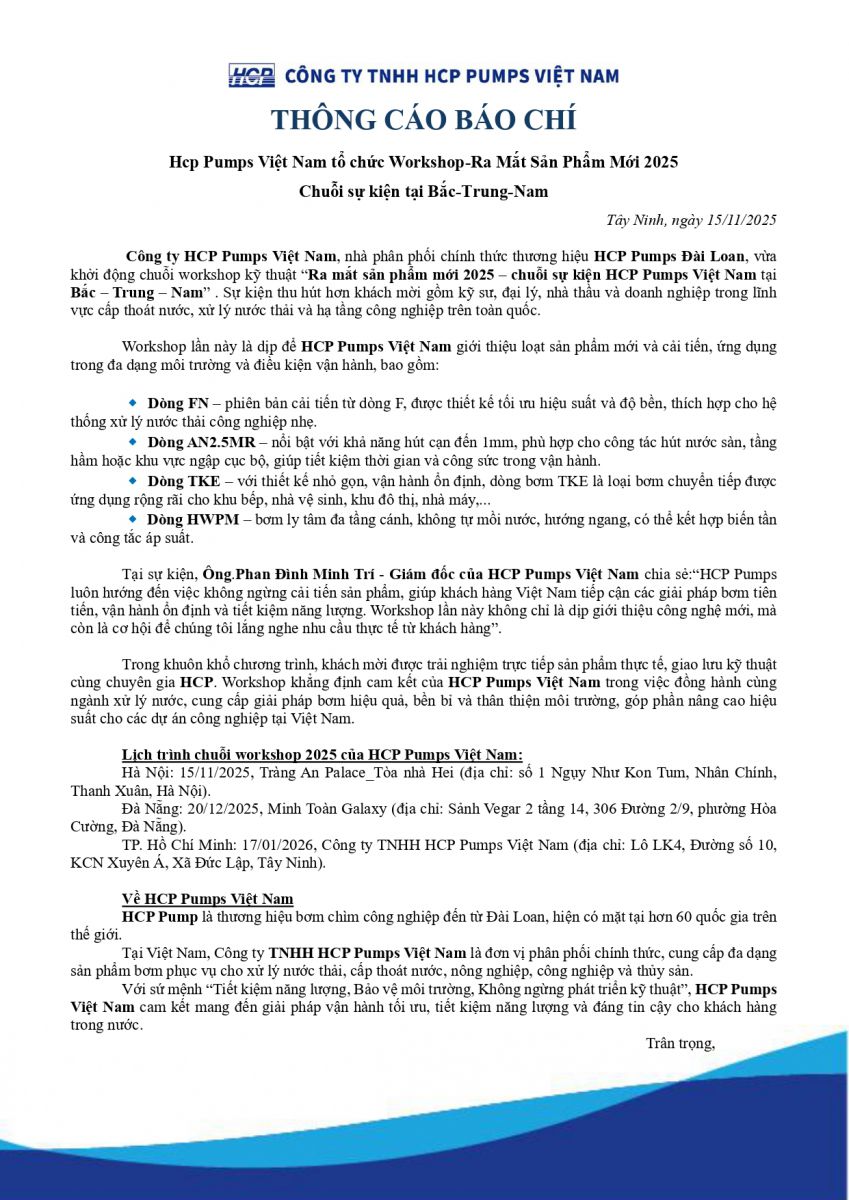 [ Thông cáo báo chí ] CHUỖI SỰ KIỆN RA MẮT SẢN PHẨM MỚI 2025 – HCP PUMPS VIỆT NAM