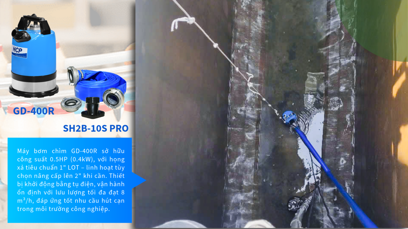 Nước đọng ở đáy tank, chỉ còn lại vài milimet – quá thấp để các thiết bị thông thường xử lý. Việc vệ sinh không triệt để có thể ảnh hưởng đến an toàn vận hành. Công ty Y đã tin tưởng lựa chọn sản phẩm của HCP GD-400R – dòng máy bơm chìm chuyên dụng cho hút nước đọng, với khả năng vận hành ở mực nước chỉ 5mm và hút sạch đến 1mm cuối cùng.
